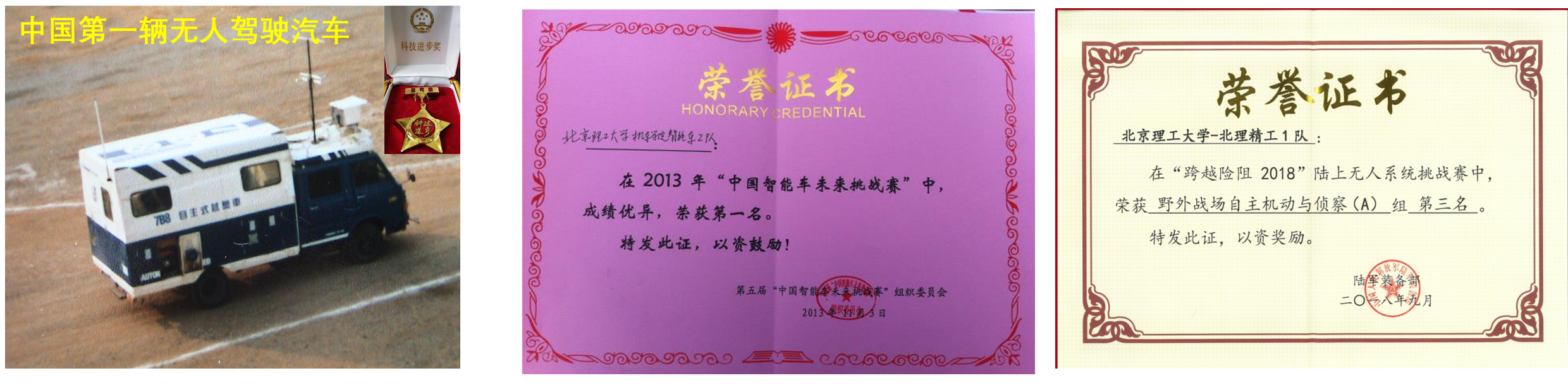 汽车研究所在智能车辆领域研究技术积累雄厚、成果丰富。在1990年至1995年间,研制了我国第一辆无人驾驶车辆(国防科工委资助,南理工、禁忌书屋 、国防科大、清华大学、浙江大学参研),并于1999年获国家科技进步三等奖。紧紧围绕国家重大需求,在智能车辆自动操控技术领域取得了系列突破并得到系列应用,于2019年牵头获国家科技进步二等奖,同时获数十项部级科技奖励,为国防和国民经济发展作出重要贡献。同时,研究所页获得了中国智能车未来挑战赛第1名(2013)、第2名等多项奖励,在陆军跨越险阻地面无人系统挑战赛各组别中名列前茅,2023年获得A1组自主机动、A2组自主侦察比赛中均获第1名,D4组自主协同比赛中获第2名。其中,陈慧岩教授、龚建伟教授个人均获国家自然科学基金委关键技术贡献奖。