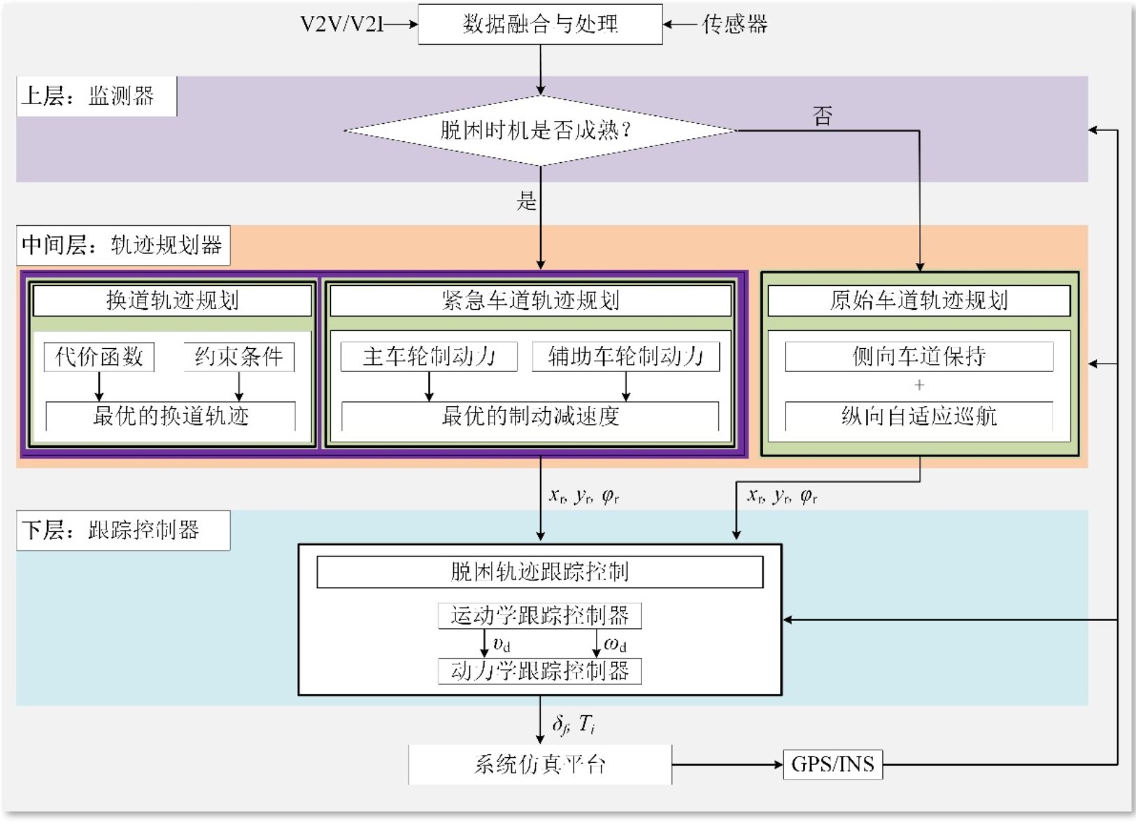 开展了爆胎、碰撞等极限工况下车辆自动脱困研究,剖析了极限工况下车辆运动力学特性,发展了基于多项式理论的车辆自动脱困轨迹规划方法,提出了计及道路交通环境的人机协同脱困分层控制方案,开展了驾驶人在环的虚实结合试验验证工作。