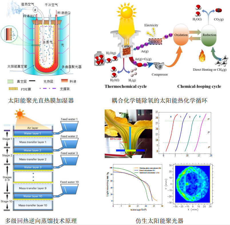 针对太阳能利用存在的低密度、间歇性、利用效率低等问题,创新地提出了高效透射式聚光、柔性聚光等太阳能系统;提出了耦合化学链循环除氧和高温电解余热余气回收的新方式,提高太阳能到燃料的转化效率;发展了太阳能海水淡化过程的热力学循环理论,建立了超高效率、超耐盐多级回热型可扩展系统。未来将继续耕耘高效聚光集热技术、高效太阳能热化学制氢技术、及基于光热的热-氢-电-水综合利用与海水/苦咸水深撤资源化利用技术研究。