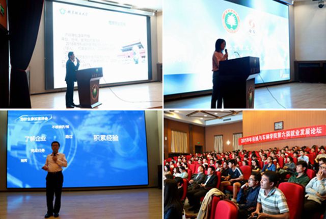 就业工作报告”,介绍了在就业工作指导思想引领下的工作开展情况和特色创新:学院生涯发展服务中心工作的创新和机制变革,“企业大讲堂”、“笑迎职场”、暑期企业实习项目等特色品牌开展情况。最后,本次论坛活动特别邀请北汽福田汽车股份有限公司人力资源部总监潘平进行了“大众创业,万众创新”背景下制造及汽车行业前景分析与汽车行业人才生涯发展分享。潘平介绍了汽车行业的总体发展与形势、单位用人标准以及应届毕业生在求职面试、职业发展过程中需要考虑清楚、处理得当的问题。