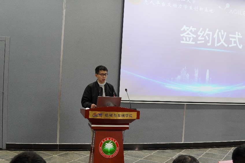 基本情况,重点介绍了学生创新创业方面取得的卓越成绩,强调学校的工程教育和改革离不开各个企业的介入与支持,希望通过与松灵机器人的校企合作能够在多维度取得更大的成果。