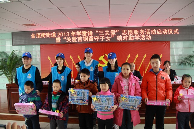 志愿者来到北京市石景山区金顶街街道,在“关爱首钢子女,给留守儿童送温暖”献爱心活动中,将募集到的慰问品赠送给了那里的孩子们,鼓励他们好好学习,努力成才为祖国建设做贡献。3月5日,“首钢关爱”项目推进暨“学雷锋”青年志愿服务活动启动仪式在石景山区老山街道活动中心隆重举行,志愿者们现场接受了由石景山团区委赠送的锦旗。自首钢集团搬迁以来,由于首钢职工工作时间忙碌和地点远离家庭,很多首钢子女成为了留守儿童。2012年5月起,禁忌书屋