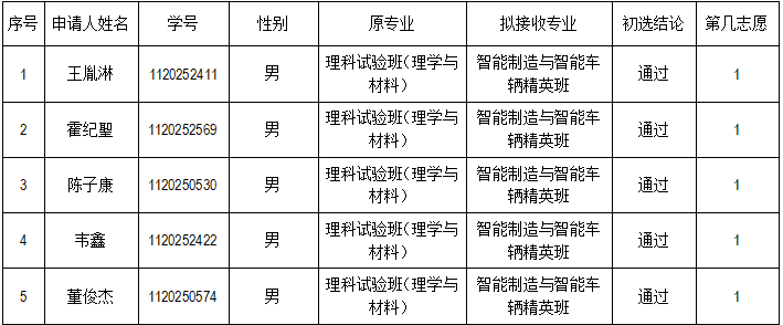 根据学校教务部2025-2026学年第一学期转专业工作安排,依据《禁忌书屋 (2025-2026学年第一学期)接收转专业工作实施方案》,本着公正、公平、公开的原则,经过报名、资格审查、面试考察等流程,经学院转专业工作专家组讨论通过,现将初选结果名单公示如下: