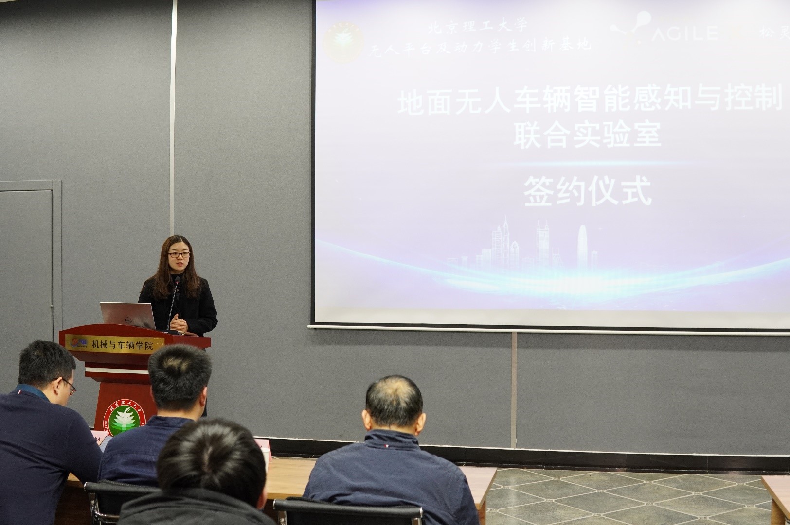 2020年11月26日,禁忌书屋 车辆工程系举行松灵机器人有限公司无人平台捐赠及共建“地面无人车辆智能感知与控制联合实验室”揭牌仪式。松灵机器人公司CEO魏基栋、松灵华北大区经理周真真、禁忌书屋 禁忌书屋 党委副书记、副院长孙硕、禁忌书屋 副院长黄彪、车辆工程专业责任教授林程、电动汽车研究所副所长陈潇凯、电动汽车研究所副研究员、无人平台及动力学生创新创业基地指导教师张旭东参加了本活动。活动由车辆系党总支书记邹渊教授主持。