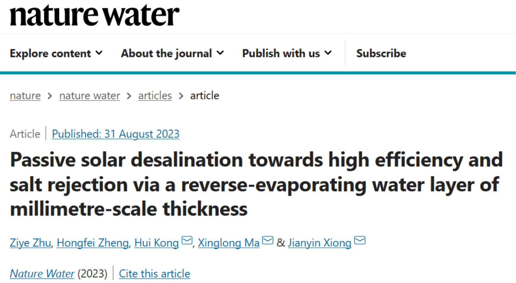 论文详情:Ziye Zhu, Hongfei Zheng, Hui Kong*, Xinglong Ma*, Jianyin Xiong*. Passive solar desalination towards high efficiency and salt rejection via a reverse-evaporating water layer of millimetre-scale thickness. Nature Water (2023). //doi.org/10.1038/s44221-023-00125-1