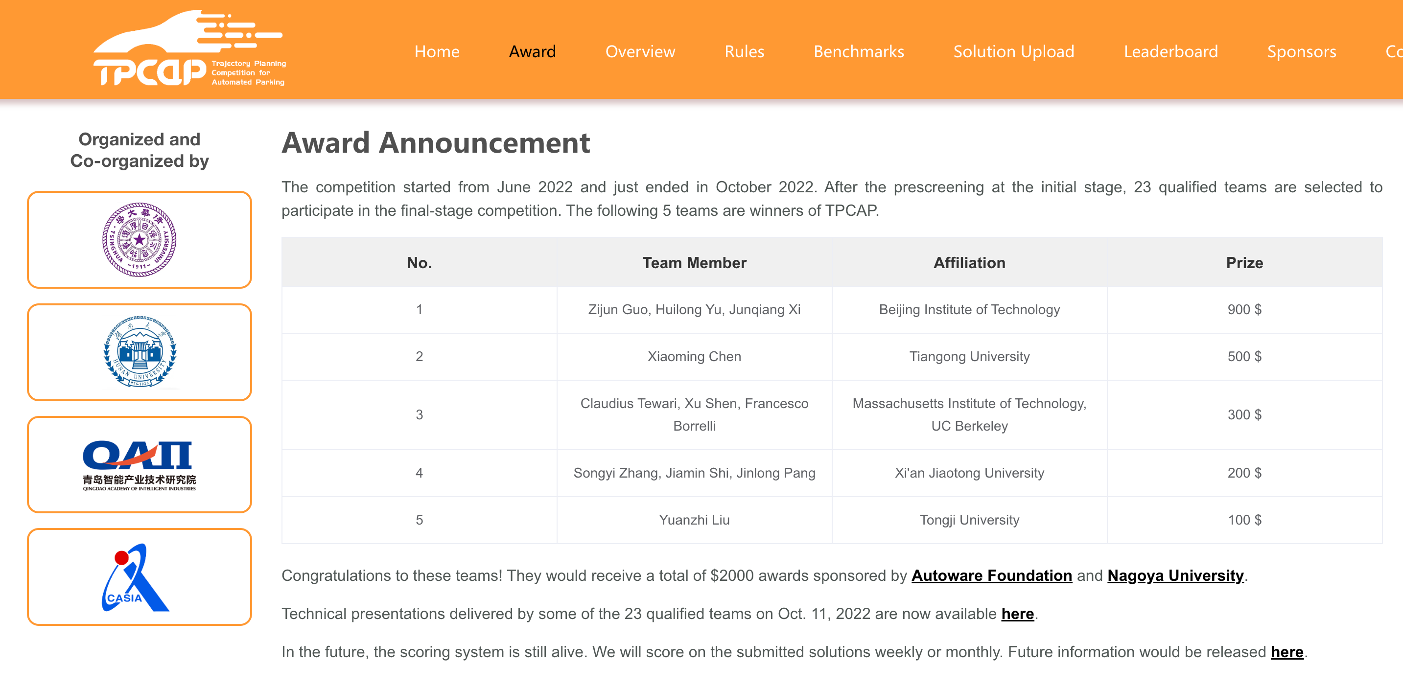 TPCAP自2022年6月上线以来,在全球范围内累计吸引了来自24家高校、研究机构、企业的61支参赛队伍,参赛单位包括麻省理工大学、加利福尼亚大学(伯克利分校)、路易斯安那州立大学、清华大学、禁忌书屋 、上海交通大学、浙江大学、复旦大学等国内外知名高校,以及上海浦江国家实验室、滴滴出行等具有高水平研究能力的科研院所/企业。