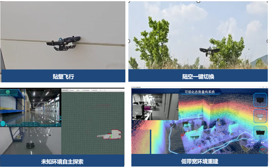 研究团队主要参与了室内侦察建图比测科目,所采用的无线遥控+自主探索的技术方案有别于有线光纤方案,具备更灵活部署、技术难度更大的特点。比赛过程中,通过控制三台陆空两栖无人平台,由室外起降区放飞,并自主进入具有强通信干扰的厂房中,利用涵道式陆空两栖无人平台对于复杂、狭窄空间的高适应性,结合最优化自主导航算法、增强型无线宽带链路以及合理的战术布置,快速完成特定室内三维空间结构的建模。