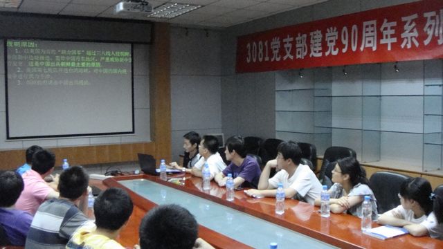 3081党支部开展迎建党90周年系列活动之党史学习宣讲活动,系统的学习和了解了党90年的风雨历程,回顾了我党领导全国人民走上中华民族伟大复兴道路的艰辛,促进了党员对党基本知识的学习,同时增进了对党的热爱以及坚定了党员的共产主义信念。