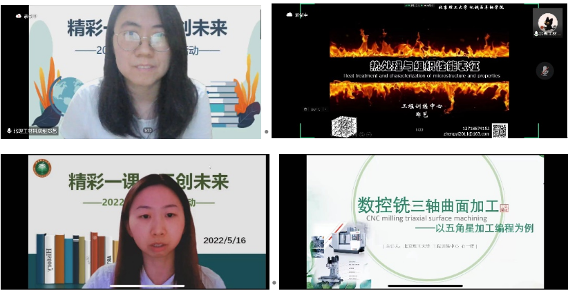 工程训练中心教师郑艺围绕一把具有民族特色的保安腰刀进行了《热处理与组织性能的表征》理论课程的教学展示,教师石一珺以五星徽章的数控铣削加工为例,在线演示了三轴曲面加工的实践教学展示。两位教师教学基本功扎实,条理清晰,课堂感染力强,受到了同仁的高度评价,展现了工程训练中心青年教师的风采。