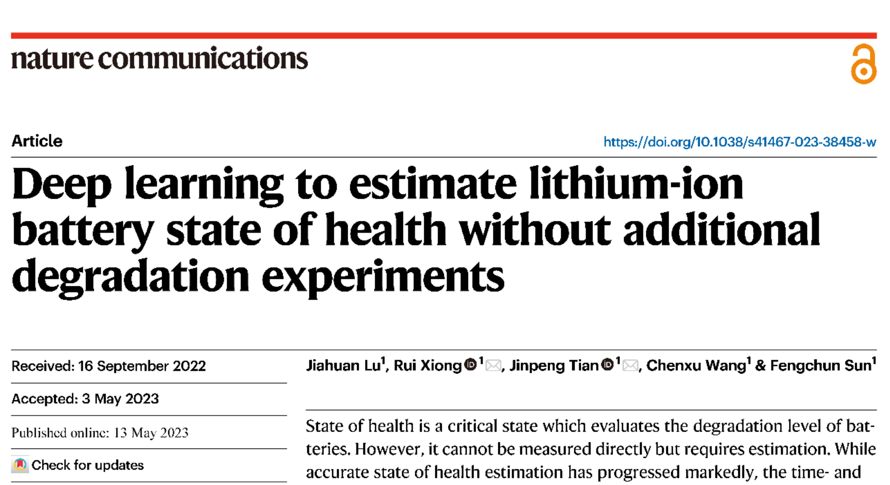 近日,禁忌书屋 电动车辆国家工程研究中心孙逢春院士、熊瑞教授团队在《自然通讯》杂志上发表论文“Deep learning to estimate lithium-ion battery state of health without additional degradation experiments”,提出了不依赖额外电池老化测试的健康状态快速评估方法。该方法直接利用已有电池数据实施新电池健康状态评估,打破了电池健康状态评估对完备测试数据的依赖性。
